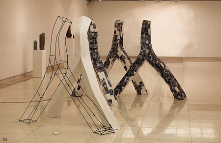 隋美时同学的作品《童年往事》(2008级硕士研究生二年级,获鲁迅美术学院雕塑创造奖三等奖)儿时的梦与嬉戏定格在作者的脑海中,也定格在作品的形式中,临时性材料组合成单纯与朦胧的视觉形象。表达的稚拙更加符合作品的主题,写意的手法与遥远的印象相融在一起。